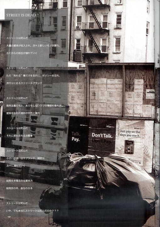 画像を見て「表紙は見た事ある!!」と思った人もいるかもしれないが、大きな書店などに行くと並んでいる“212.MAG(http://www.212mag.info/)”。 毎号、主にニューヨーク近郊の特に黒人の人達のスナップが多いのでヒップホップ関連の雑誌だと誤解されているかもしれず、特にWHATEVERのサイトをチェックしてくれている人の多くはロックやパンク等の音楽が好きな人も多いであろうから内容までは見た事がない人も多いかもしれない。 実はこの本は大阪在住の知人がほぼ一人で創っているもので(勿論、周りの人の協力もあるとは思うが)、タイミングが合った時などはWHATEVER-SHOPにわざわざ持って来てくれる。 もともとはお互い何の面識も接点も無く、たまたまWHATEVER-SHOPの雰囲気から何かを感じ偶然お店に入ってきたのだが、そこから色々話すと共通の知人も多く何かと興味深い話ができる。 俺も最初はヒップホップが好きな人なんだろうと思っていたのだが、よくよく話を聞くとタートルアイランドやボンクラ峠の事も知っていたりしたので少しビックリ。 さらに話すと勿論ヒップホップカルチャーも自身の一部だがそれ以上に大きな枠で捉えると要は真のストリートカルチャー自体が好きだとの事。 だからとくに“黒人”・“ヒップホップ”にとらわれていないに関わらず、写真の多くが黒人の人達なのにはそれなりの理由があり納得できる。 ここからは俺の解釈になってしまうかもしれないが、事実としてその地域での貧富を言うと黒人の人達の方が貧乏な場合が多いらしいが、そうすると必然的に「お金に物をいわせる事が出来ない」となる。 そうなると必然的にD.I.Y.で物事を消化せざる得なくなるが、これがまさに“真のクリエイティビティ=リアルストリートカルチャー”となるわけだ。 例えば、ダメージ加工のジーンズの賛否を語る気は無いが、それを何のD.I.Y.精神も無く買った状態のままで穿いている行為自体にリアリティが無い事は誰にも否定できないのでは無いだろうか?