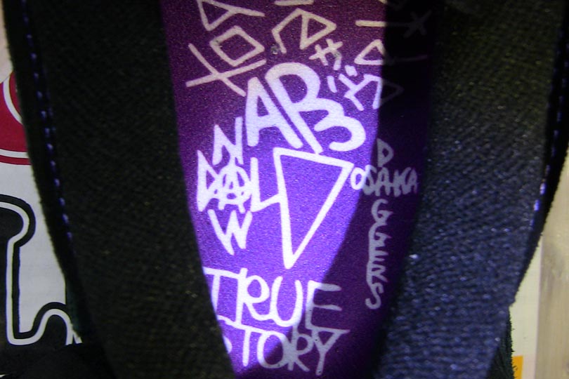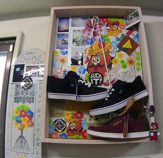 鳥取出身で大阪在住のダイキという10歳以上年下の友人がいる。 このサイトをチェックしてくれている人はスケートボードしていない人も多いだろうから説明すると、彼は精力的にSK8シーンで活動していてスケートボーダーの中では、技術、スタイル共に確立している為に全国的に評価、知名度が高い。 雑誌などではWHATEVERのTシャツなどを着て出てくれたりと宣伝も手伝ってくれていたり、COLORCODE(whev.comのトップにあるWHATEVERのSK8ライン的兄弟ブランドの様な感じ)でもチームメイトの様な感じの存在。 そんなダイキはI-PATHというSK8シューズカンパニーからスポンサーを受けていて、最近そのI-PATHライダーのシグネーチャーシューズがでたのだが、その中の一足にダイキモデルがある。 今回、そのダイキモデルを大阪のWHATEVER-SHOPでも取り扱っているのだが、シューズと合わせてダイキが自身でD.I.Y.コラージュしたディスプレイを写真に撮ったので紹介します。