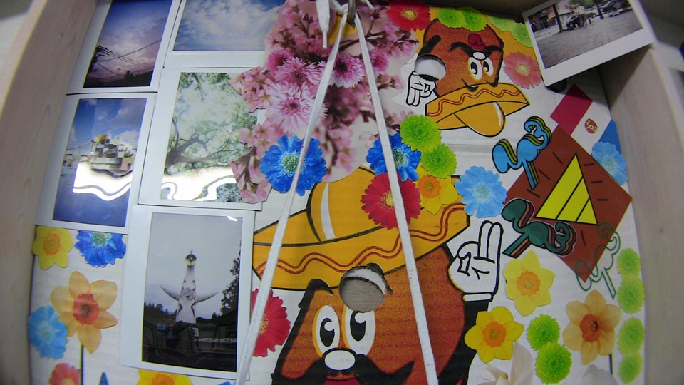 一枚目を見ると一見シンプルなSK8シューズ。 だが2枚目をみると分かるように、インソールのデザインには「DAL」・「OSAKA DAGGERS」・「三角公園を象徴する様な三角形などなど」がデザインされているクレージーな一品。 そして3枚目がディスプレイの全景、靴から茎が出て花が咲いているようにも見える。 4枚目を良く見ると分かるが、たくさんある切り抜かれた花のコラージュは実はティッシュの空き箱から一つ一つダイキ自身が時間をかけて切り抜いたもの。 お金がかからないどころか環境にも良い、まさにD.I.Y.精神のあふれたアイディア。
